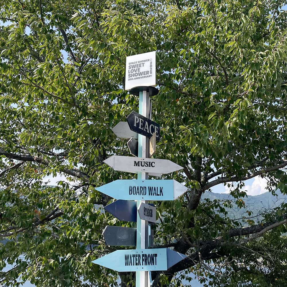場所の方向を示した案内の役割もしつつ、「MUSIC」や「PEACE」などのワードも書かれていて、