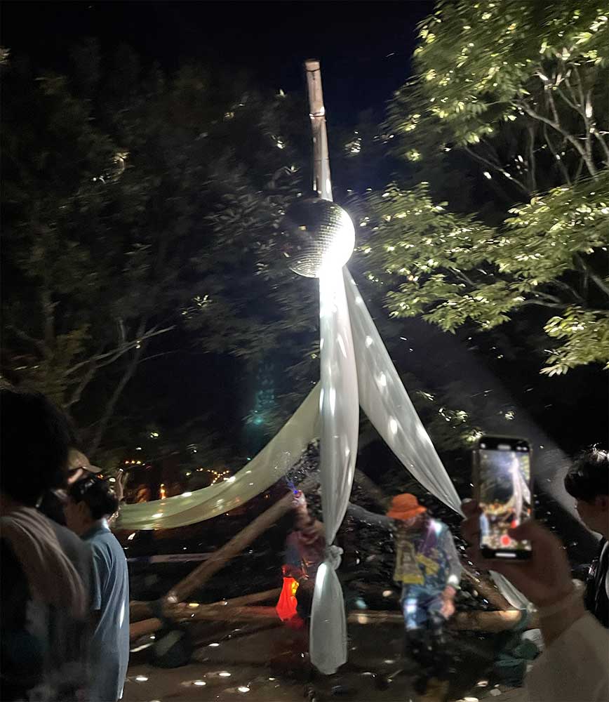 屋外にある、木に吊るされたミラーボールはとても幻想的で、そこから垂れ下がる布のデザイン、