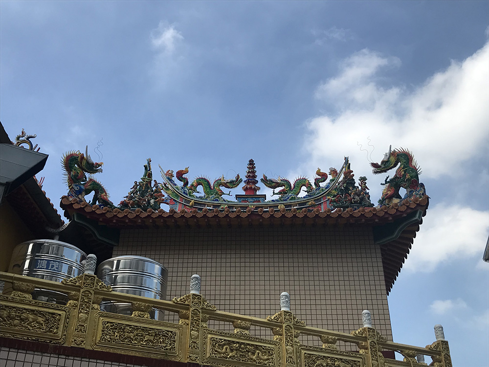 廟の屋根には「剪黏(せんねん)」という、龍や武将などをかたどった豪華な装飾がついています。